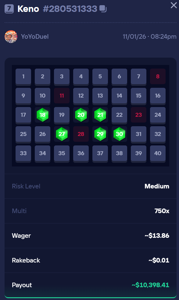 750X Win on Keno - Visit https://kick.com/yoyoduel to watch our LIVE streams and clips.
